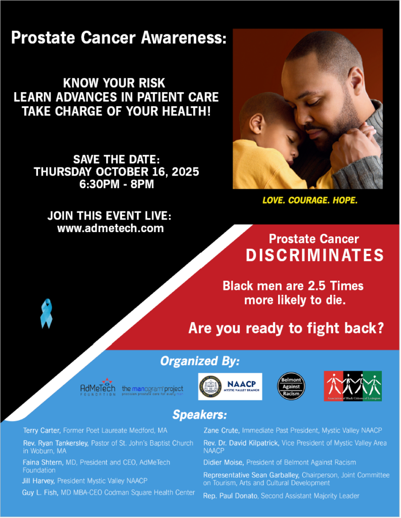The Mystic Valley Area Branch of the NAACP will host its annual Prostate Cancer Awareness program in partnership with the AdMeTech Foundation. Local partners Belmont Against Racism (BAR) and Association of Black Citizens of Lexington (ABCL) will also be
